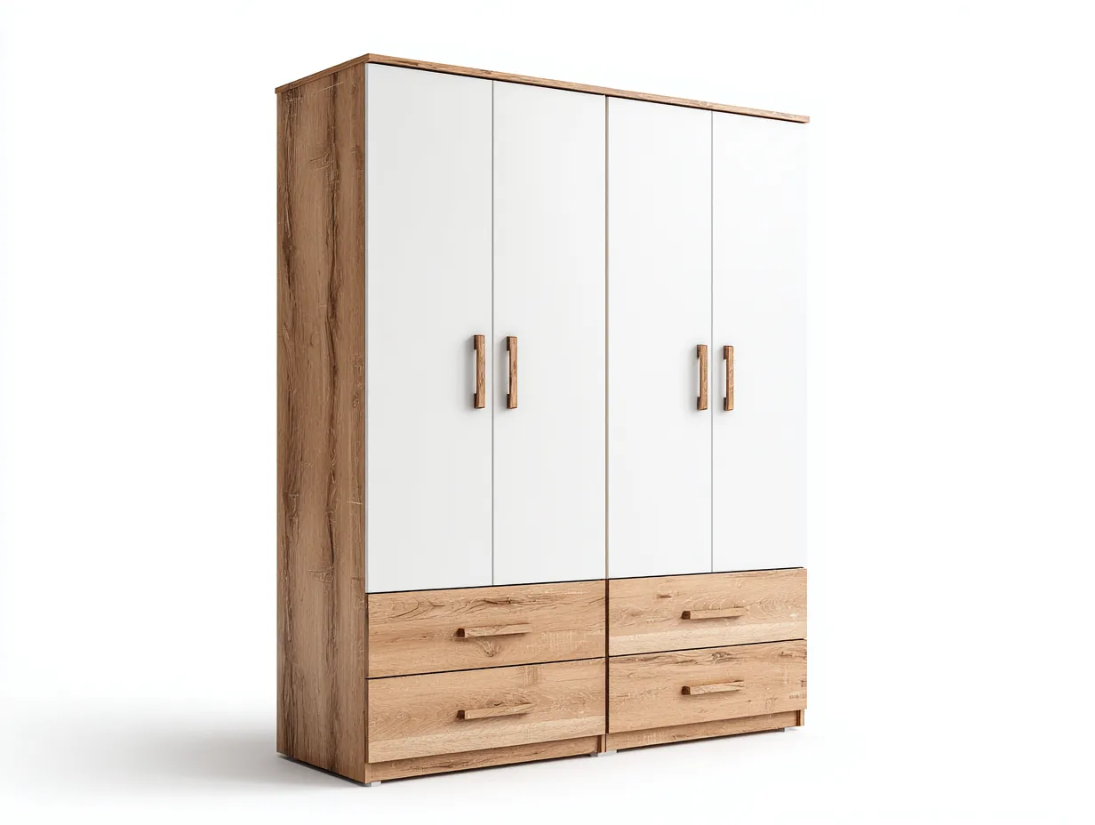 Il mobile integra ante e cassetti che agevolano la gestione quotidiana dello spazio, consentendo di organizzare indumenti e oggetti personali in modo pratico.